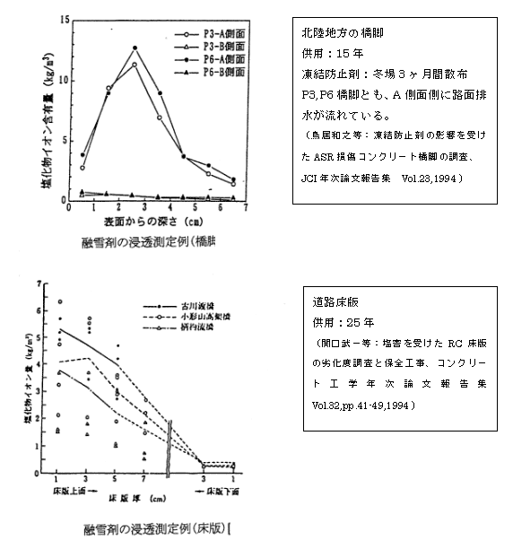 凍結防止剤として、大量の塩が撒かれるので、アスファルト舗装の下の防水シートの欠損部などを通じて塩化物イオンがコンクリート内に侵入する。また、塩を含んだ水が流れる桁端部や橋脚の被害も大きい。桁端部は、わずかな隙間によって隣の桁と接しているので、ここの鉄筋が腐食すると補修にはたいへんな労力がともなう。