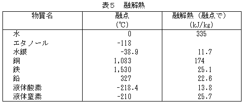 表4に水を含む種々の物質の気化熱(蒸発熱)を、表5に融解熱を示しました。