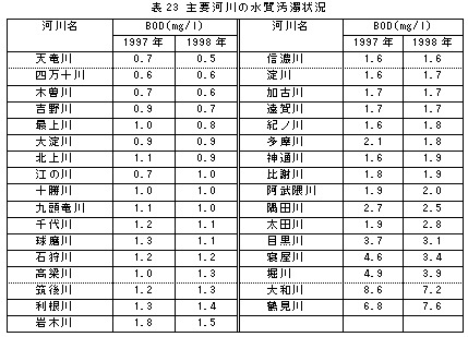 平成9、10年の環境基準達成率(環境庁調べ)は河川(BOD)がそれぞれ80.1%、81%、海域(COD)が74.9%、73.6%に対し、湖沼(COD)は41.0%、40.9%と低い値を示しています。表23、表24、表25に河川、湖沼、内湾のBOD又はCODを示しました。